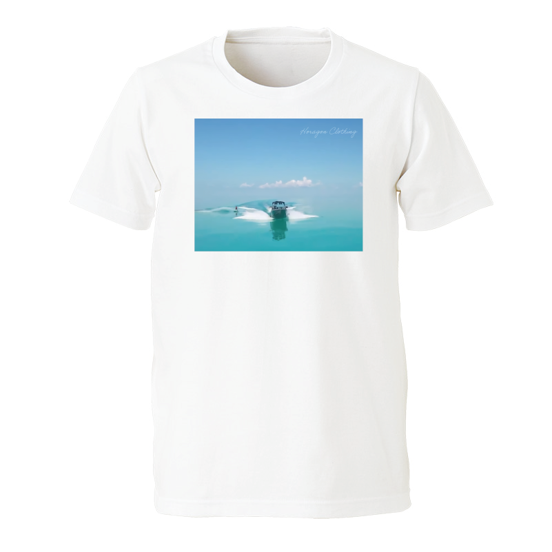 幻想的な景色の中でウェイクボードをしている写真を インクジェットプリントにて Tシャツに落とし込みました。 久しぶりのインクジェットシリーズ。